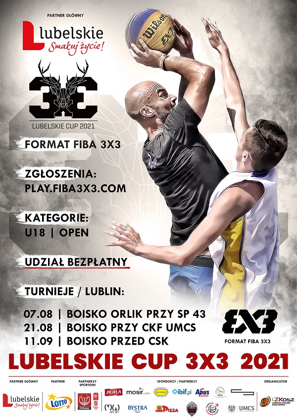 Przed nami jedno z największych letnich wydarzeń koszykarskich w Lublinie. Serdecznie zapraszamy wszystkich pasjonatów koszykówki 3X3 do udziału w cyklu zawodów pod nazwą LUBELSKIE CUP 3X3 2021. Zawody składać się będą z dwóch turniejów eliminacyjnych oraz turnieju głównego. Wydarzenie odbywa się w FORMACIE FIBA 3X3